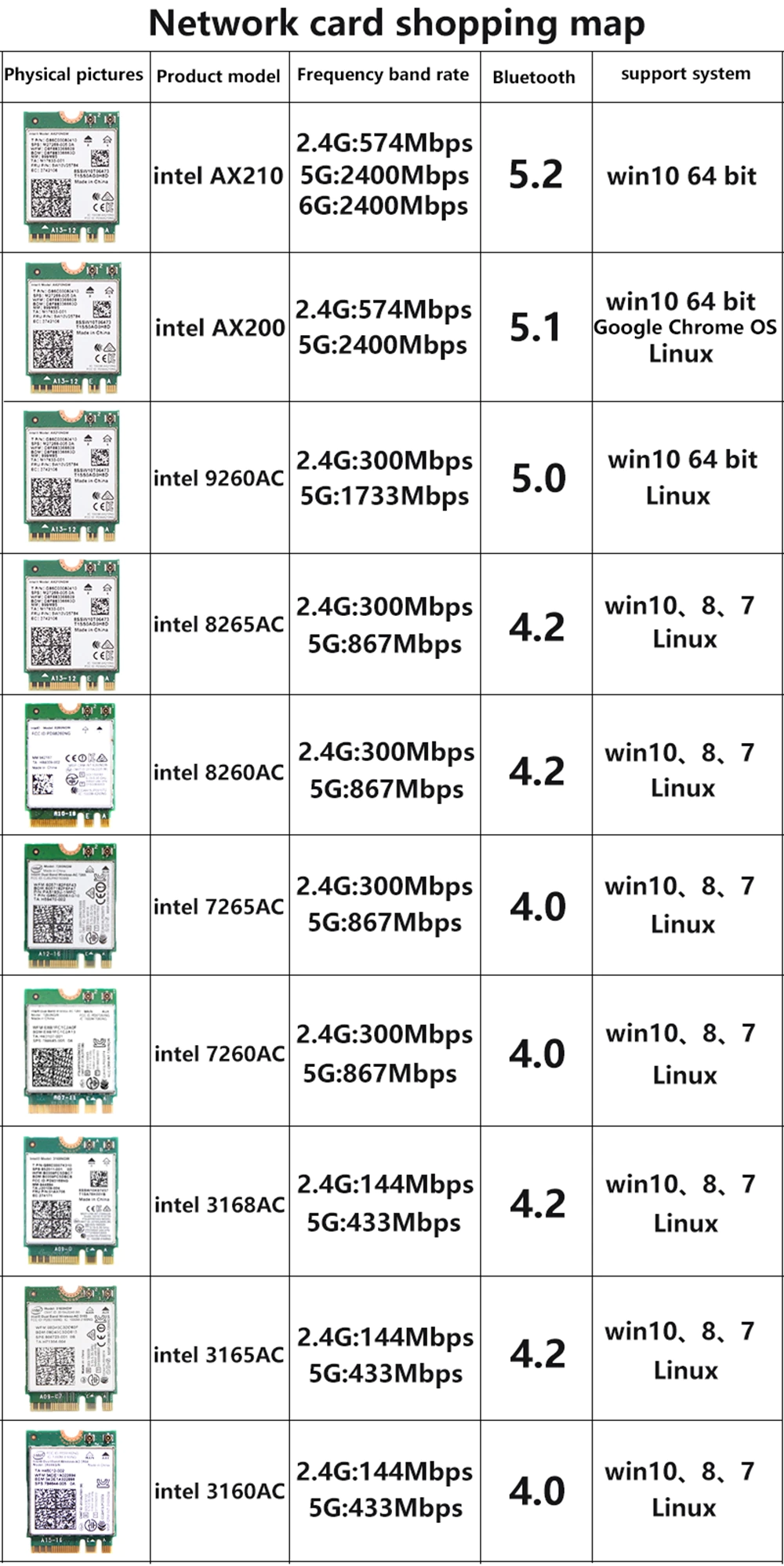 Chipest: 인텔 인터페이스: NGFF M.2 주파수 밴드: 2.4Ghz & 5Ghz & 6Ghz 전송 속도: 최대 2400 mbps까지 속도 (라우터는 160 mhz에 있어야합니다)(802.11ax); 지원 블루투스 5.2 |