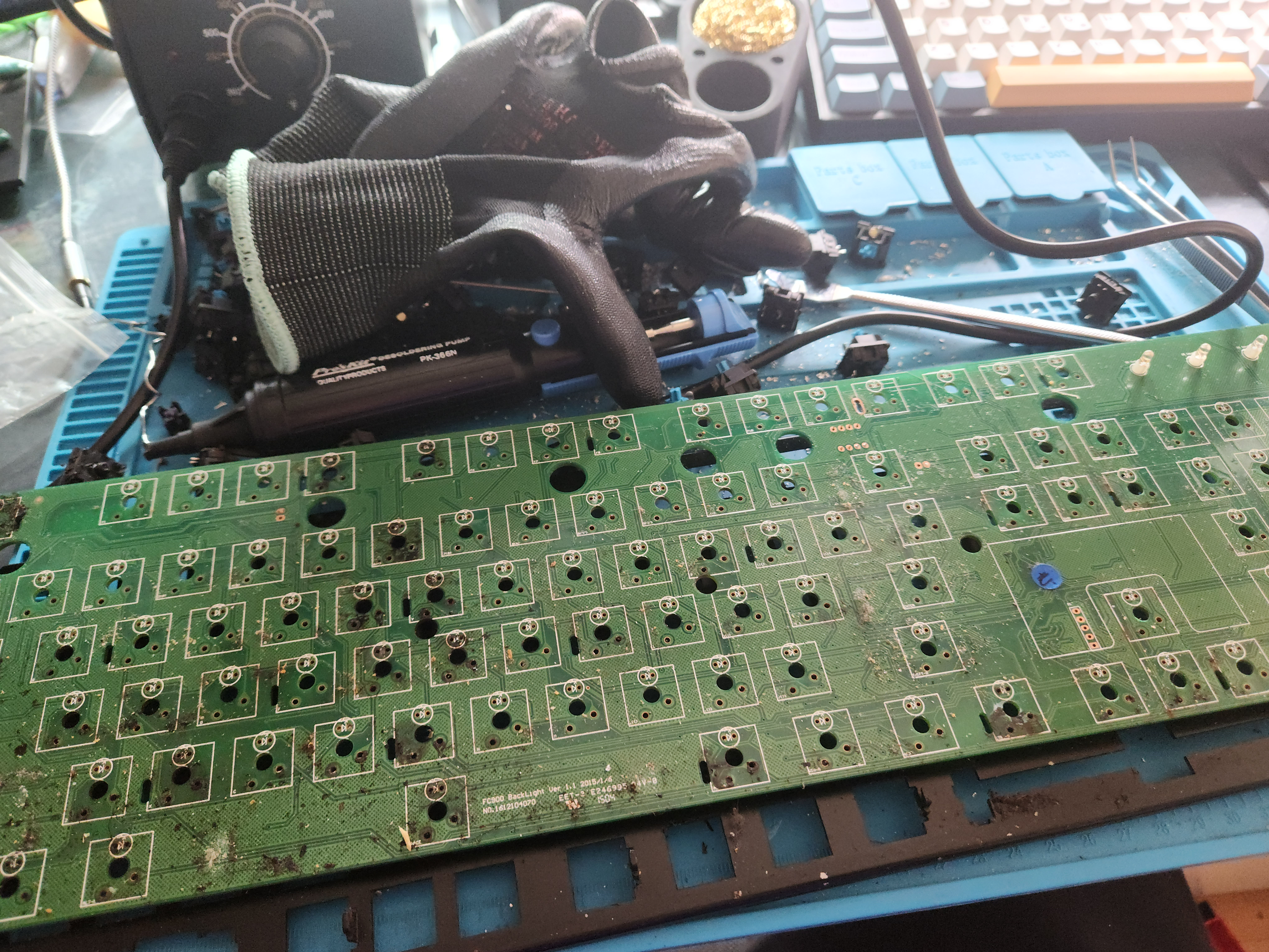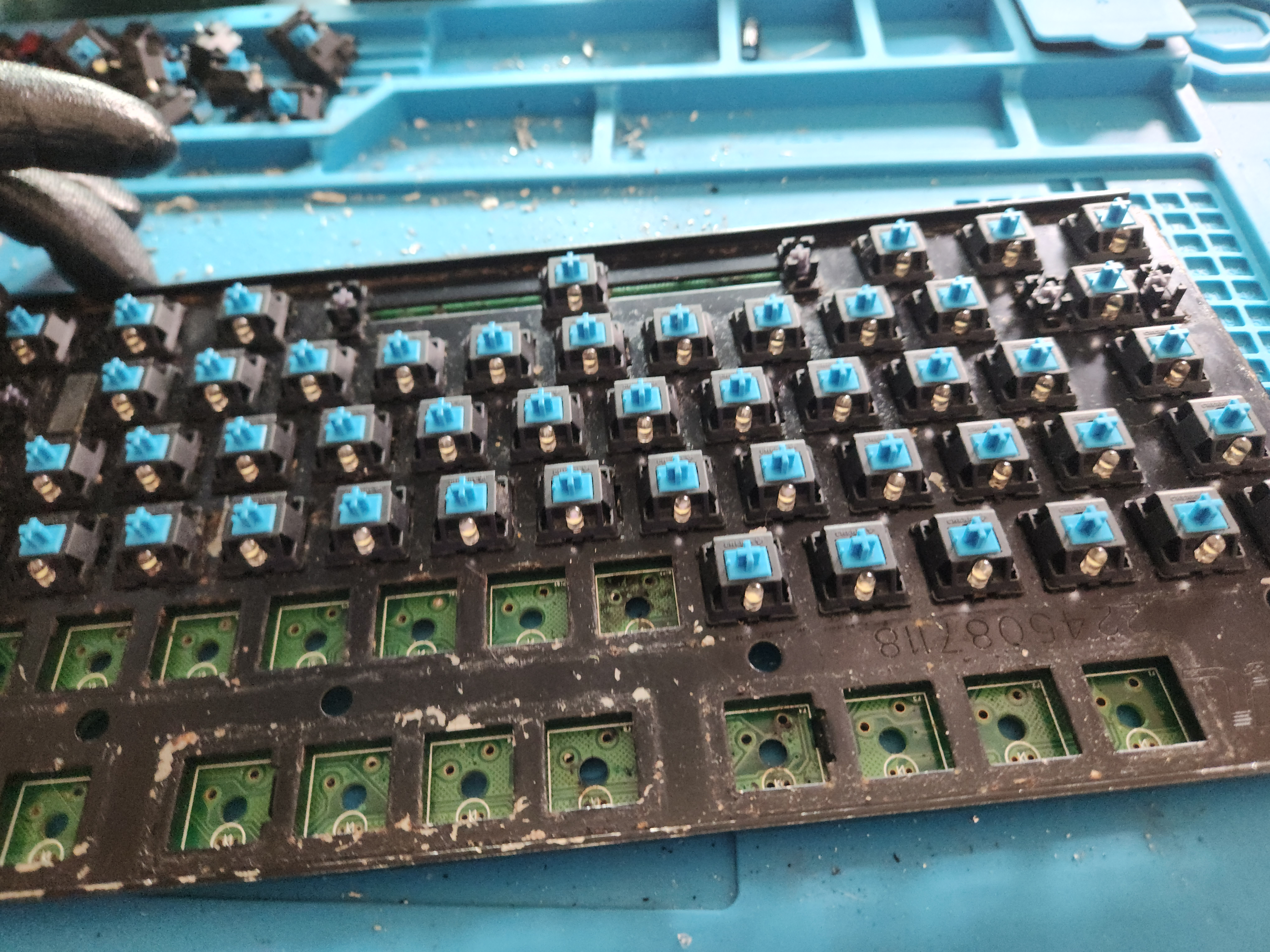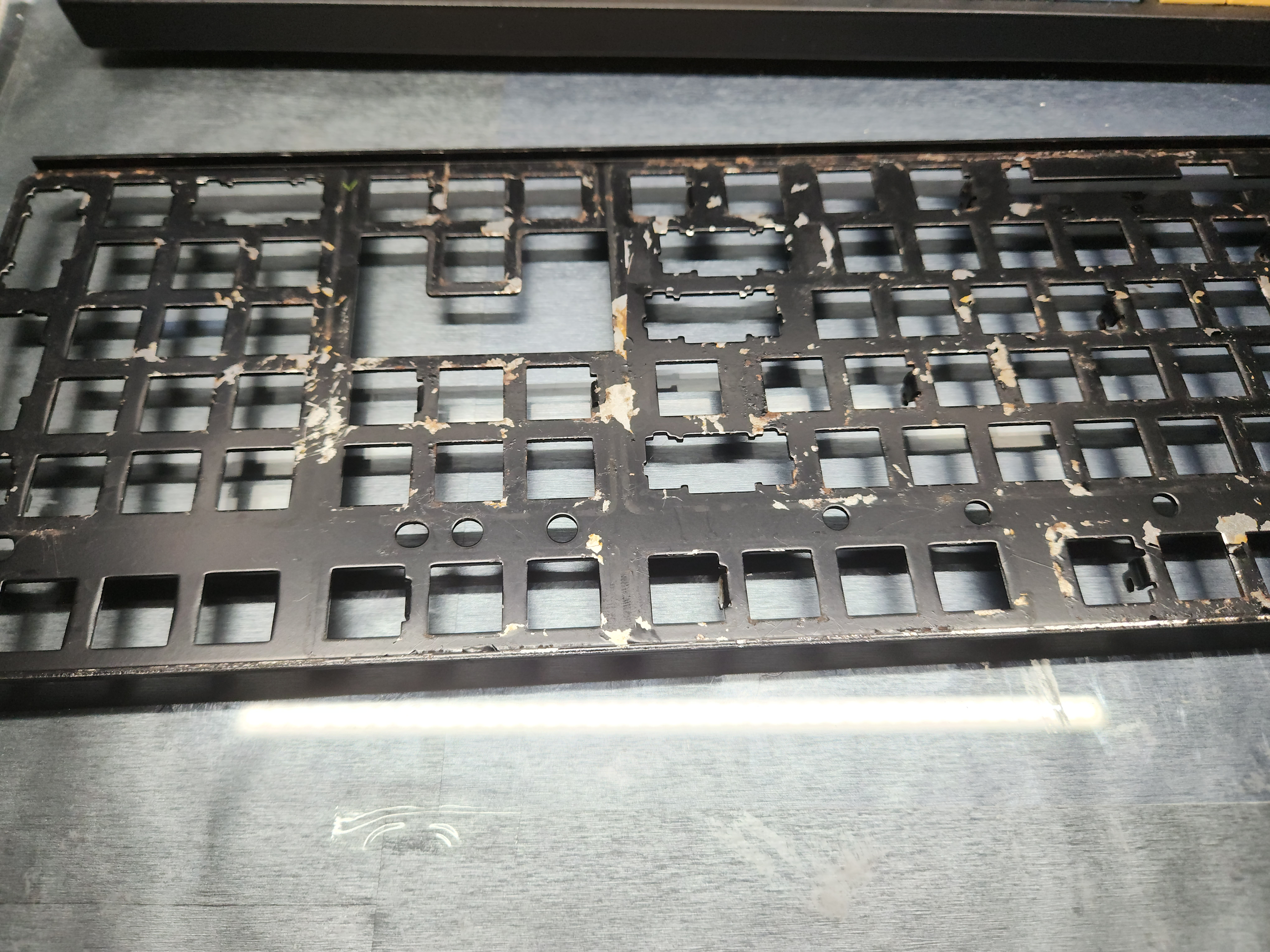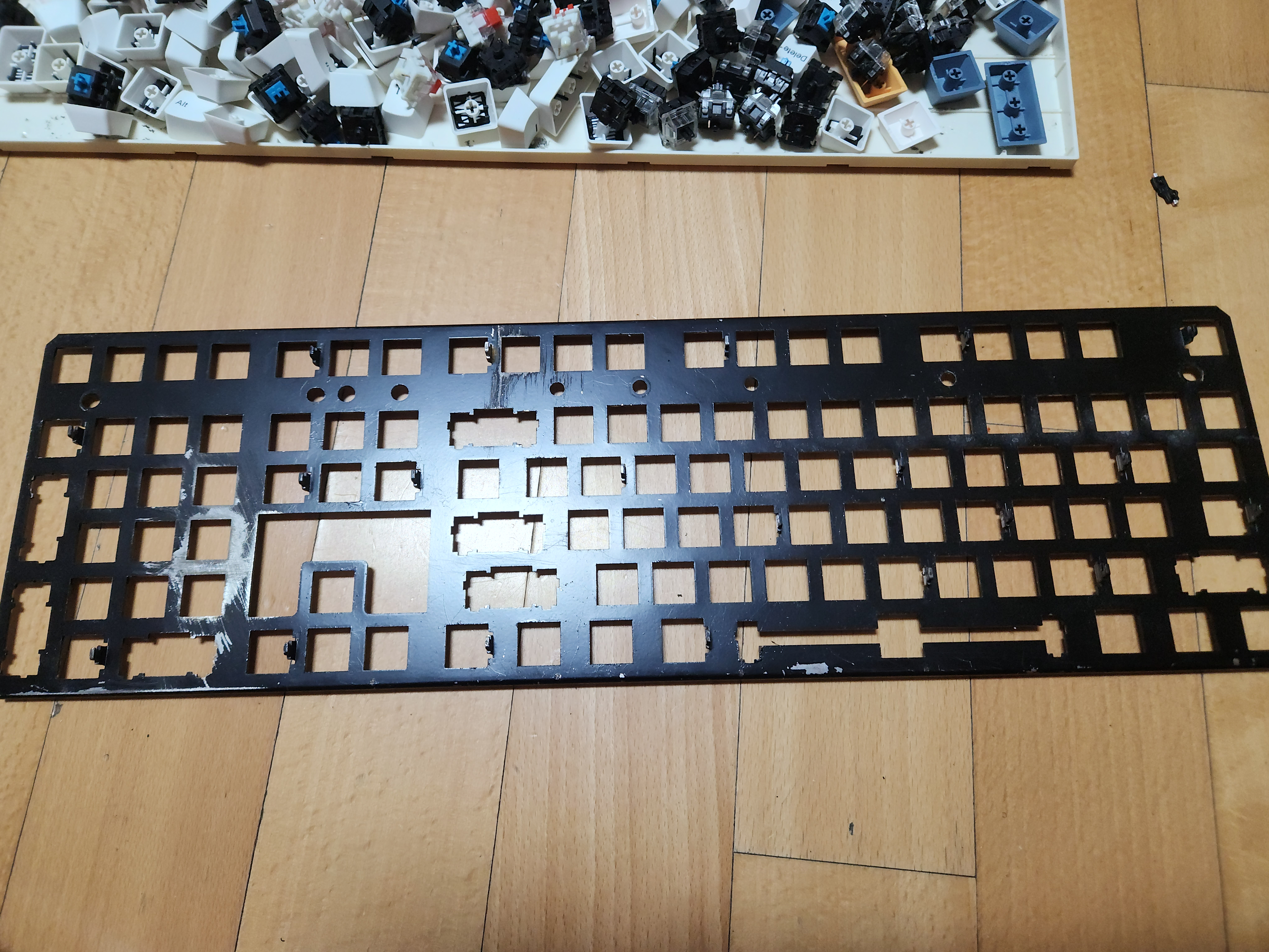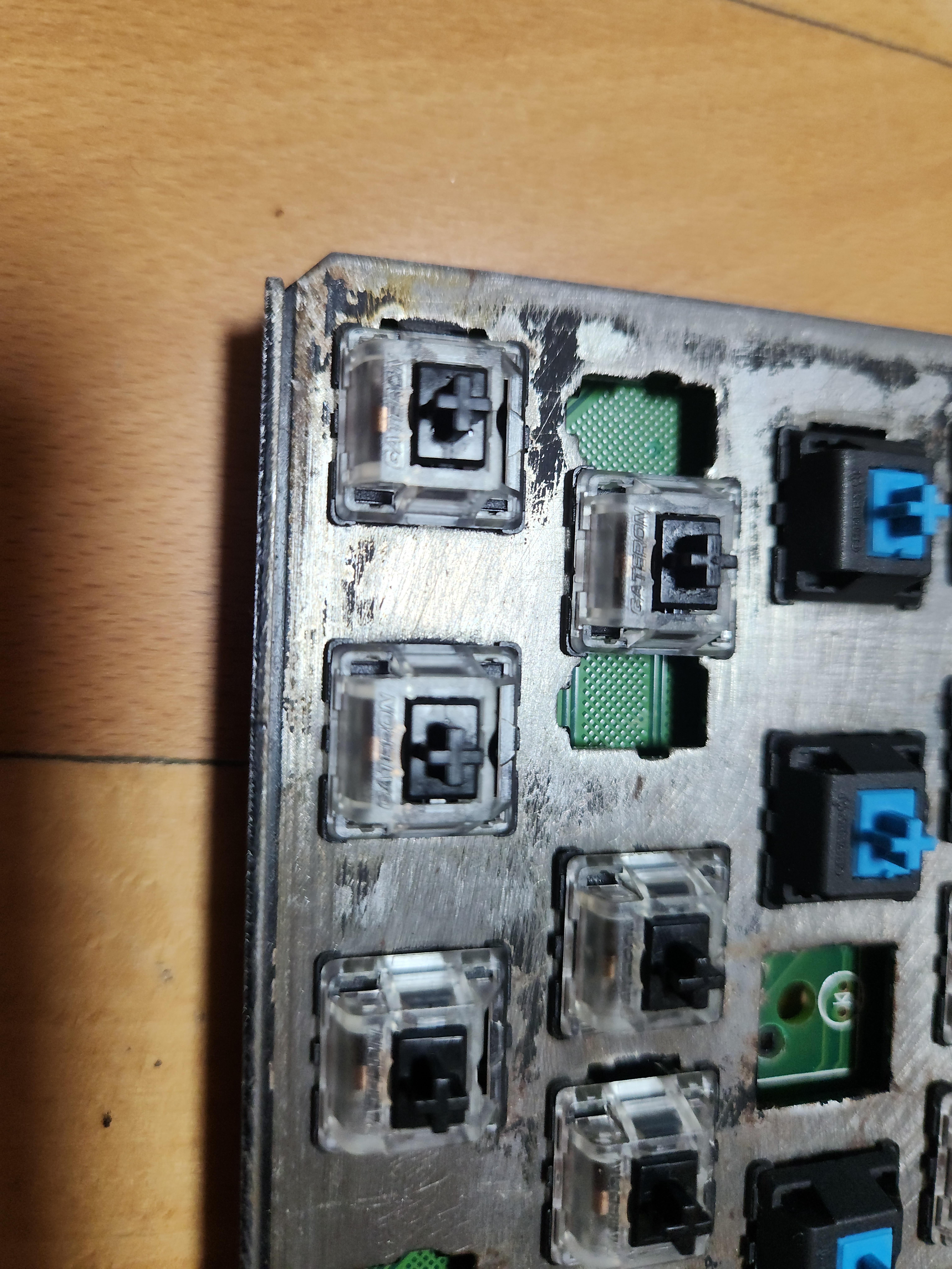 스위치가 안눌리는 것 (이건 애초에 흑축으로 바꿀 예정이였어서 문제 없음), 보강판에 녹이 있는것, 기판에도 끈쩍거리는게 많이 묻어있고, 외장재에도 묻어있다는게 문제였다.