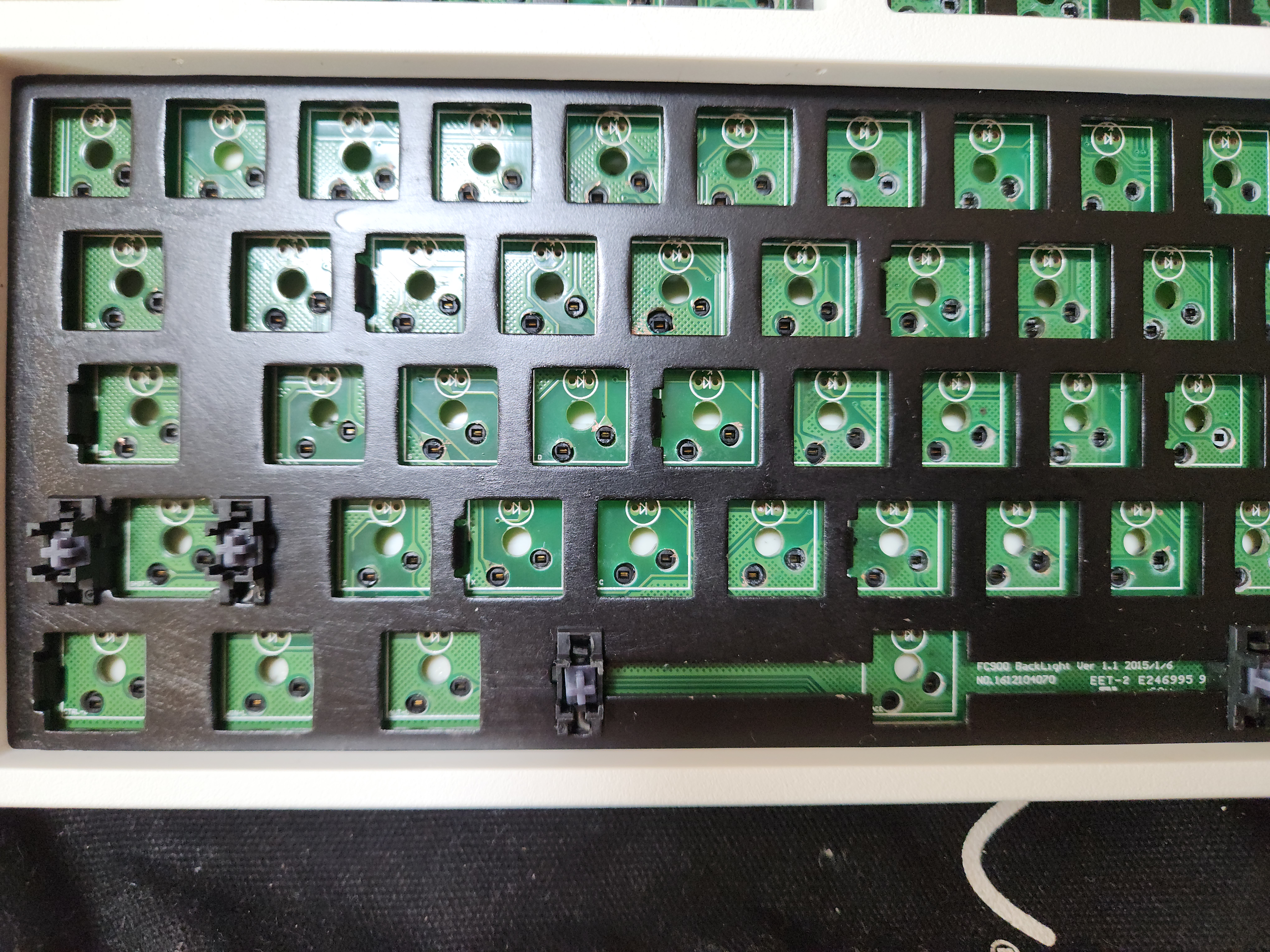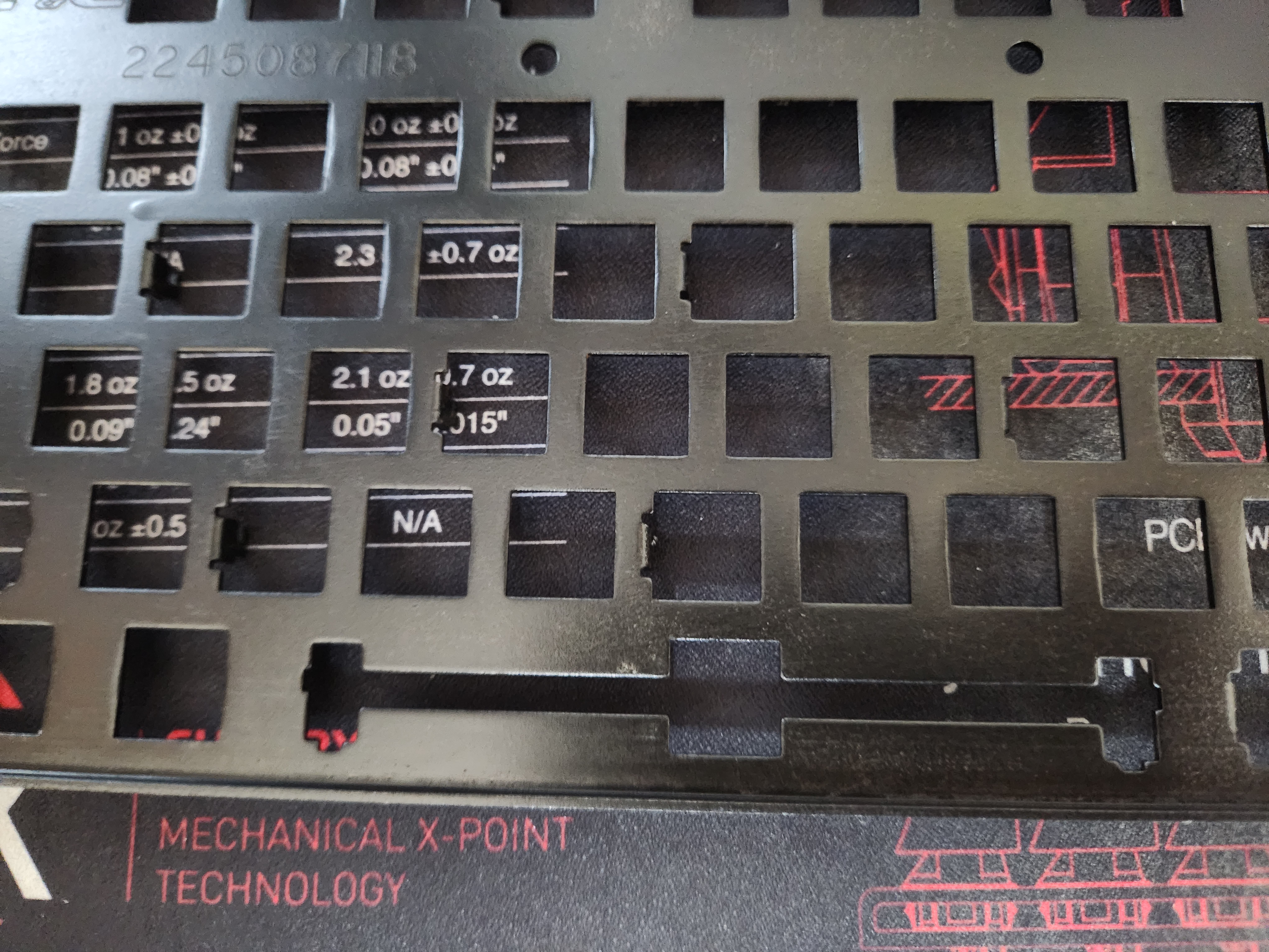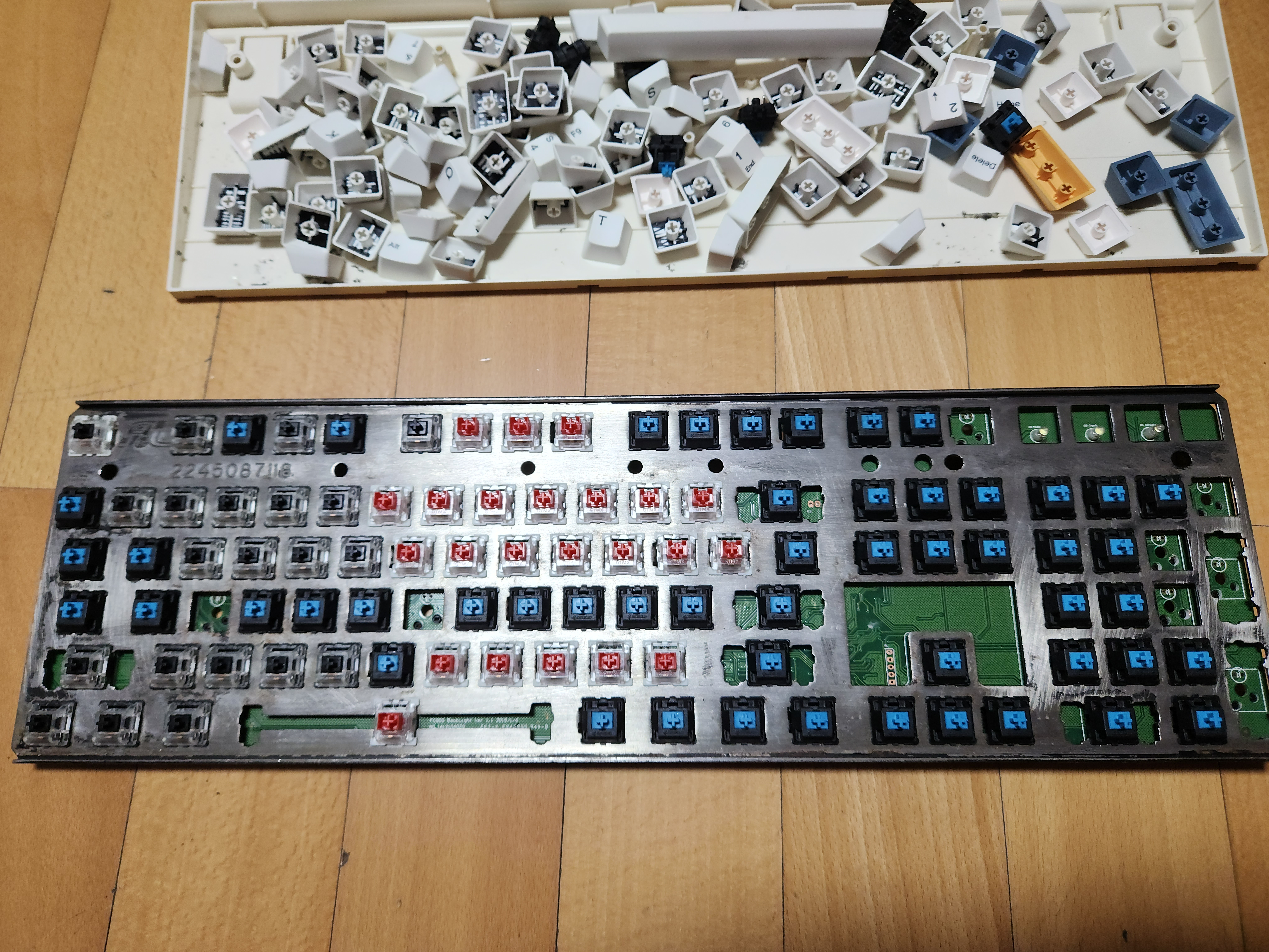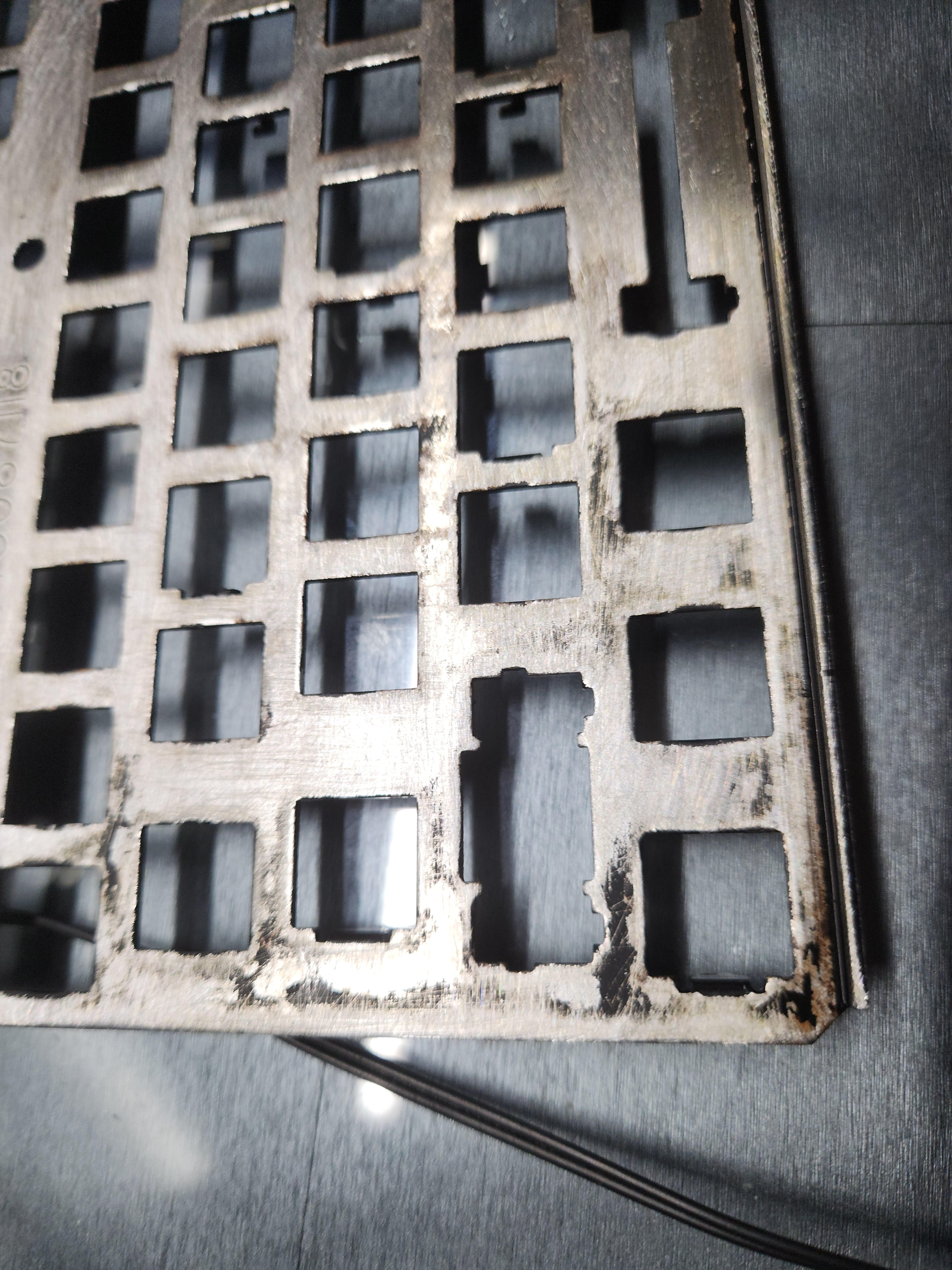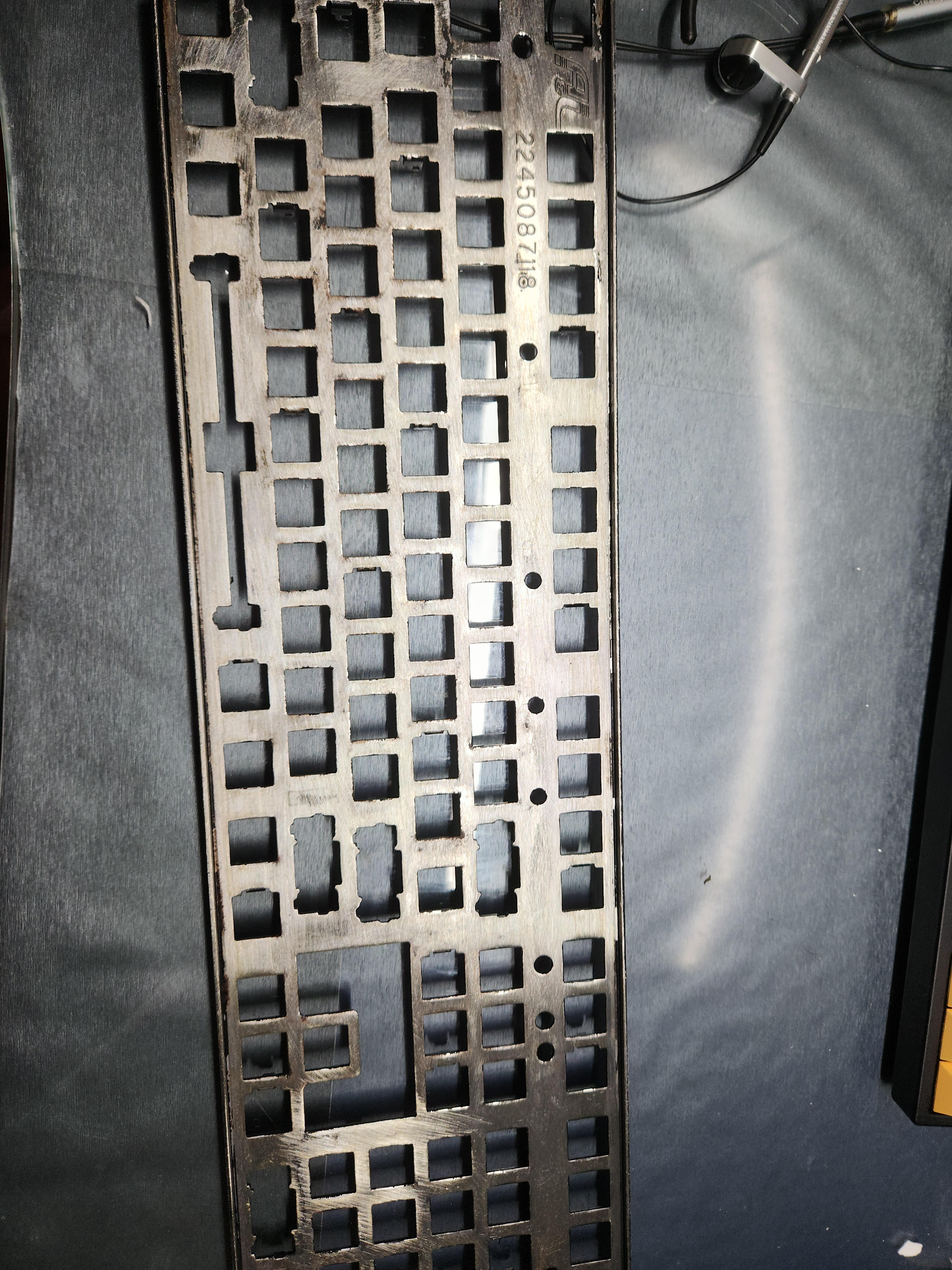 스위치가 안눌리는 것 (이건 애초에 흑축으로 바꿀 예정이였어서 문제 없음), 보강판에 녹이 있는것, 기판에도 끈쩍거리는게 많이 묻어있고, 외장재에도 묻어있다는게 문제였다.
