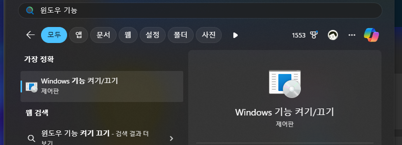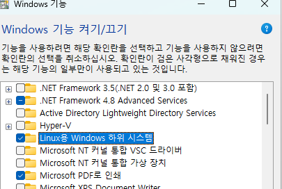 윈도우키 - windows 기능 켜기/끄기 를 검색하여 실행한다.