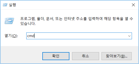 윈도우 + R 키를 같이 눌러서 CMD 창을 열어줍니다.