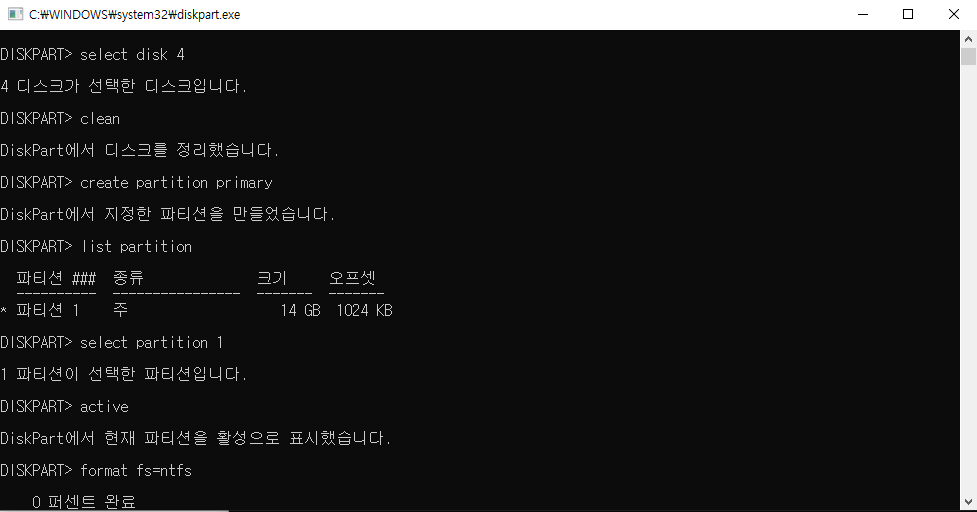 저는 ntfs 포맷을 하려고 format fs=ntfs를 사용했습니다.