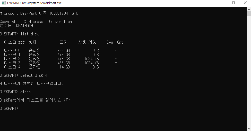 select disk 숫자를 입력 후 엔터를 눌러줍니다. 전 4번 디스크를 선택하려 하므로 selsct disk 4 를 입력했습니다.
