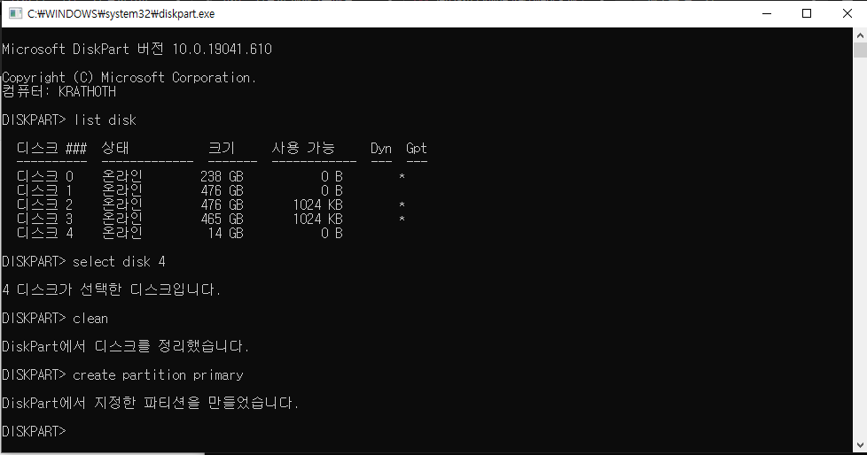 저는 16GB USB를 포맷하려 하니 디스크 4를 선택해주겠습니다.